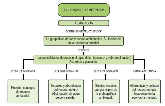 En el siguiente mapa conceptual se sintetiza la secuencia del contenido “La geopolítica de los recursos ambientales. Su incidencia en la economía mundial” (idem, p. 226), teniendo en cuenta el primer recorte planteado por el programa escolar vigente: “Las posibilidades de acceso al agua dulce (escasez y sobreexplotación). Acuíferos y glaciares”. En dicho esquema se proponen los recortes del contenido a realizar para abarcar su totalidad, y además se indica el orden en el que dichos recortes serán abordados.