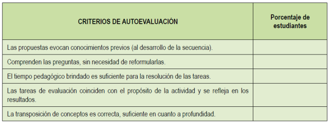 En la siguiente tabla se sintetizan los criterios a observar durante el transcurso de la secuencia, para visualizar si existe un avance significativo en los estudiantes. En caso de que los resultados no sean los esperados, se reflexionará y alterará la planificación diaria. Para lograrlo se explicitan criterios de autoevaluación docente a efectos de mejorar la práctica educativa.