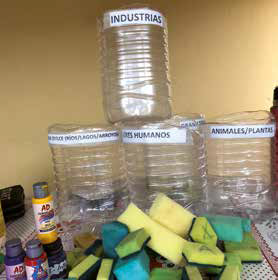 Cada actor (estudiante que está representado con una vincha que indica si representa a un animal, fábrica, poblador, etc.) tiene una esponja, alguna de ellas manchadas con pintura (la cual representa contaminación como, por ejemplo, las fábricas). Por tanto, cada estudiante absorbe agua con su esponja en el “río”, y luego la vierte en su recipiente.